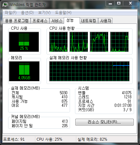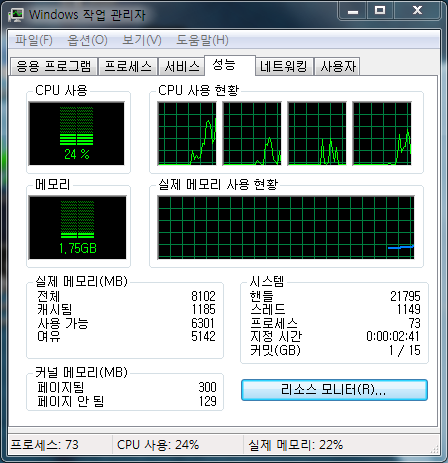 음...... 대기상태여서 메모리가 1.75GB밖에 되질 않지만, 대충 눈대중으로 초록 막대를 4배 해서 보면 5GB 때보다 훨씬 넉넉하다는 것을 알 수 있다.