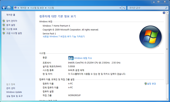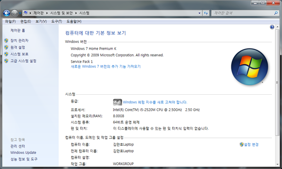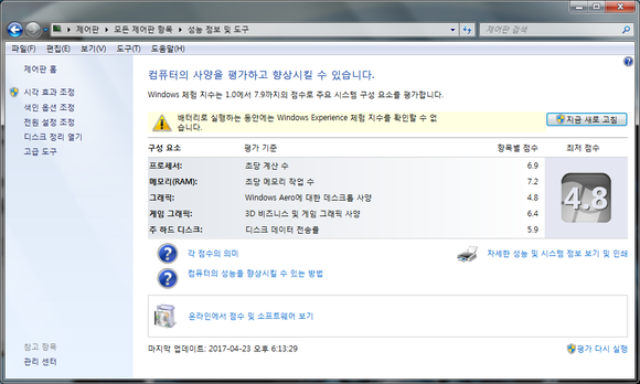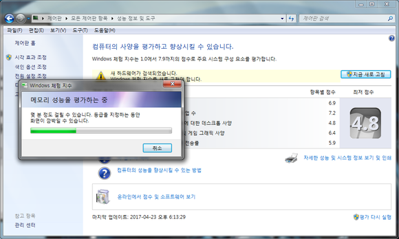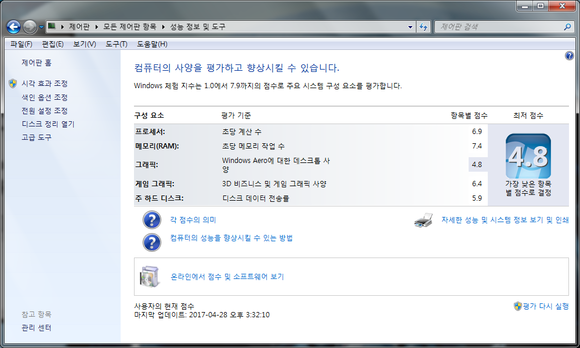 급하게 찍은 업그레이드 이전 Windows 7 체험지수.
