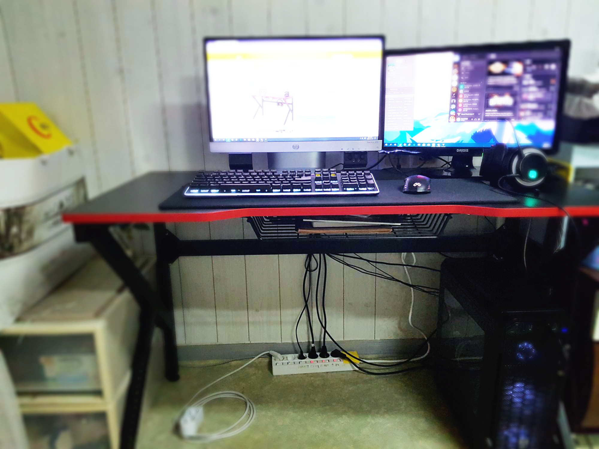 구매를 결정하면서 우려했던 점으로 '과연 집에 어울리는 디자일일까 너무 튀지 않을까'와 '아래쪽이 전부 드러나는데 선정리가 될까', '컴퓨터와 기타 것들을 어떻게 두어야 할 것인가'가 있었는데 전부 조립하고 배치 하지 생각보다 지 혼자 확확 튀지 않고 무난무난하게 어울렸으며 선은 기존의 책상보다 공간이 넓고 백트레이에 어댑터와 남는 선뭉치를 전부 박아 넣어서 나름 깔끔하게 정리되었다. 선정리 하려면 백트레이는 필수인듯. 배치는 기존 책상 그대로 하여 사실상 확장된 공간인 왼쪽이 횡하니 남았다.