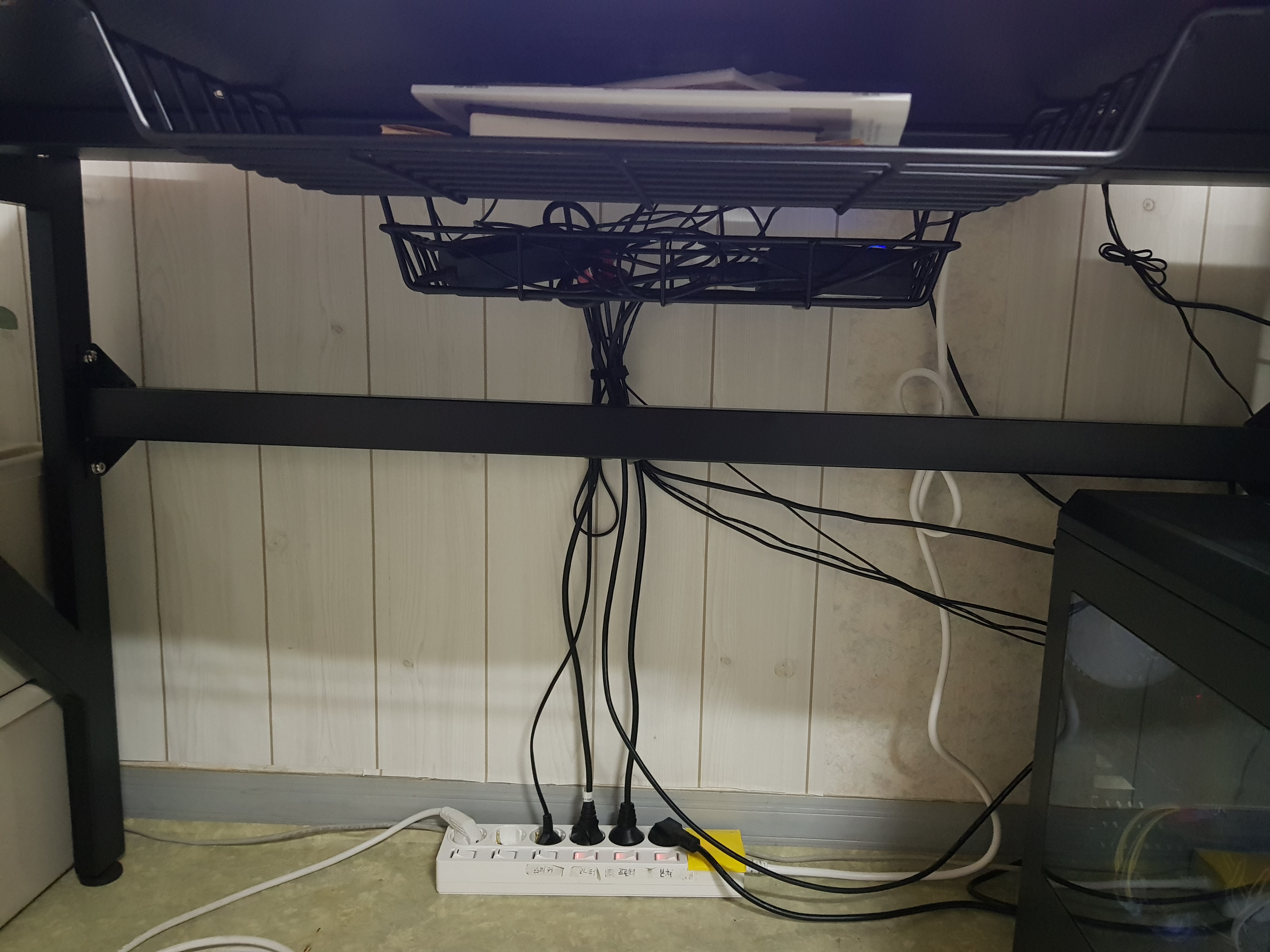 아래쪽 선정리를 보자면 어댑터는 바닥에 냅두고 모니터 어댑터(벽돌) 2개를 먼저 백트레이에 넣고 굵은 전원선 세 줄을 다이소 선정리하는 그걸로 벽에 붙혀서 정리했고, 나머지 컴퓨터 선은 나중에 검은색 벨크로 타이로 일(一)자 기둥에 묶어서 안보이게 정리했다. 저 백트레이만 보지 않으면 그럭 저럭 깨끗함 ㅎㅎ;;